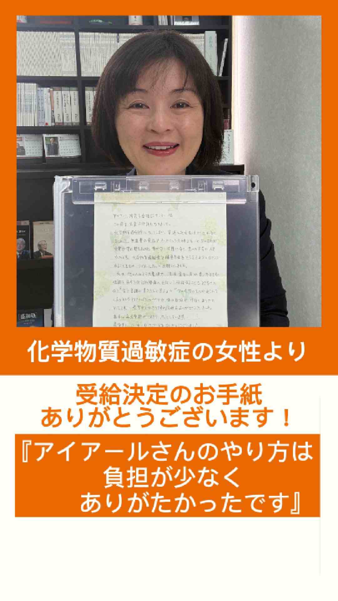 私は、他の人のスマホ電波や洗剤・柔なん剤の香りなどでも体調を崩すため公的機関へ出向いて相談することもできなかったので、「家で書類に書き込んで送る」→「次の段階のものが送られてくる」というアイアールさんのやり方は体の負担が少なくありがたかったです。一段階ずつわかりやすい説明をありがとうございました。