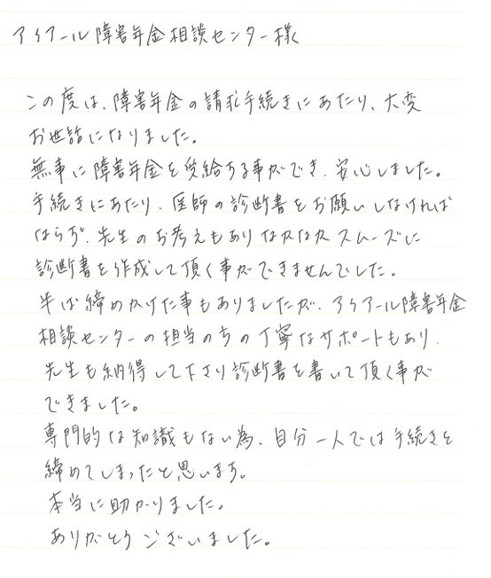 半ば諦めかけた事もありましたが、アイアール障害年金相談センターの担当の方の丁寧なサポートもあり、先生も納得して下さり診断書を書いて頂く事が できました。