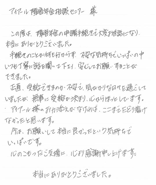 この度は、障害年金の申請手続きで大変お世話になり、本当にありがとうございました。