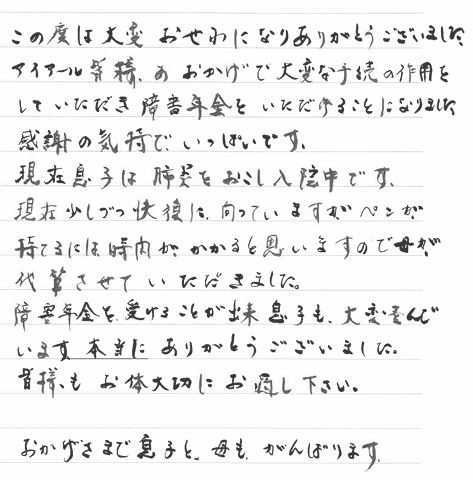 障害年金を受けることが出来息子も、大変喜んでいます。本当にありがとうございました。皆様もお体大切にお過し下さい。