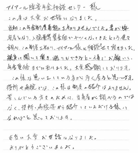 当初この年金制度自体を知りませんでした。妻が障害者となり、入院費等資金面でキツくなってきたところ色々調べ、この制度を知り、アイアール様に相談させて頂きました。親身に聞いて頂き、遡りもできるという事でお願いし、年金受給までに至りました。大変感謝しております。